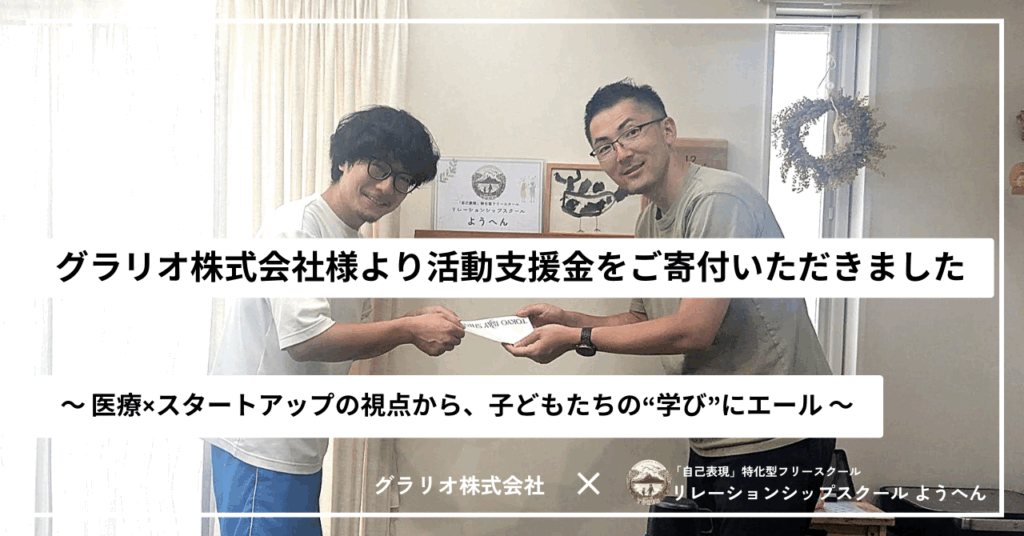 この度、グラリオ株式会社様(共同代表:水上 裕貴様・成相 佑輔様)より、リレーションシップスクール ようへんの活動に対し、活動支援金のご寄付を賜りました。